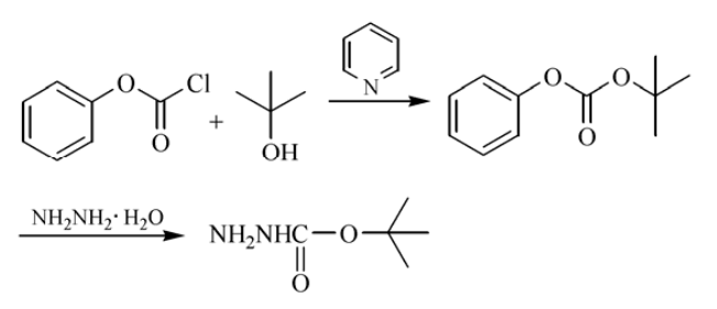 向反應(yīng)釜中加入80%水合肼水溶液122g,控制釜溫80℃,將上步所得的叔丁酯苯基碳酸酯全部滴加到反應(yīng)釜內(nèi),滴加完畢后將釜溫升至100℃,保溫?cái)嚢?h;然后向釜內(nèi)加入352g氯仿,攪拌3h;將釜溫調(diào)至25~30℃之間,滴加10%氫氧化鈉溶液480g中和苯酚,生成酚鈉;將釜液轉(zhuǎn)入分液漏斗中分出上層水,水層用氯仿萃取,用水洗滌有機(jī)層,最后合并有機(jī)層蒸餾回收氯仿,用石油醚重結(jié)晶,保溫放料,室溫風(fēng)干5h后得到白色晶體96.4g,其純度為98.8%,收率為93%,兩步總收率為71.7%。